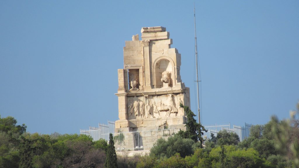 Vanaf de Akropolis een grafsteen zichtbaar, met goed inzoomen duidelijk te zien watvoor beelden erop staan.